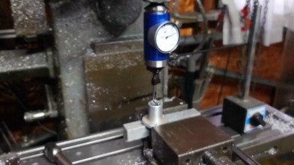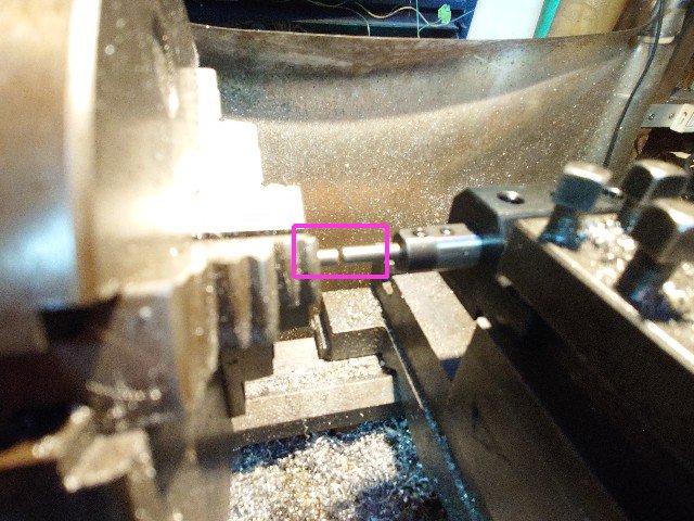 旋盤のセンタと合わせてみます。チャックに6mmのドリルを固定して差分を測りました。あと0.6mmほど追加で削る必要があります。