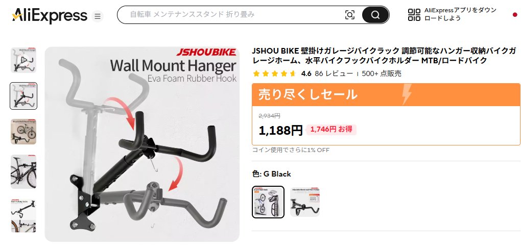 こちらはアリエクスプレスで購入の自転車用ハンガーです。1000円ちょっとで買えます。タイヤを外すメンテの時に重宝しそうです。