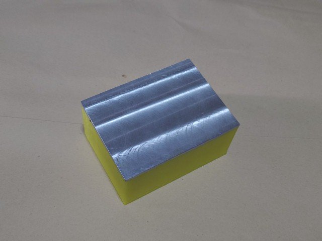 早速、昨日作ったABSケースを嵌めてサイズを確認します。良いようです。端材は厚みは約12mmなので、この後、カバーの裏側を削って余分な部分を取り除く必要があります。また、FETの表面と接続するブロックも必要です。