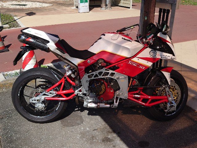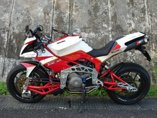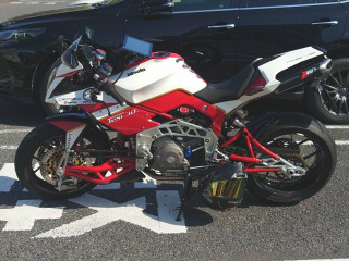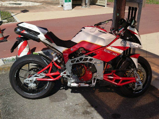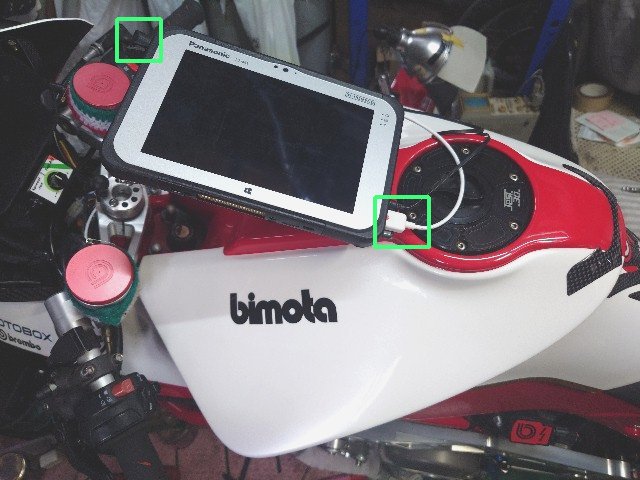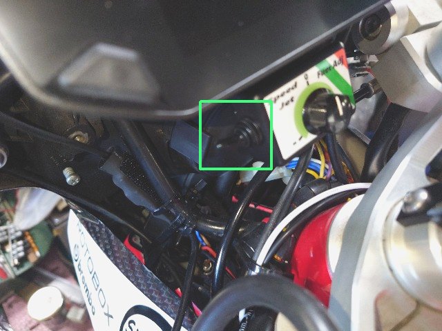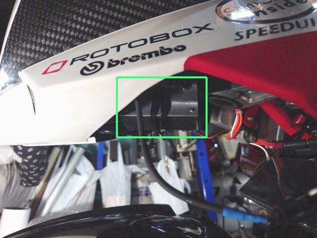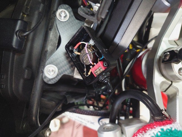 新しい電源はフロントカウルの右下に固定します。10インチの時はヒューズを介してバッテリ直付けでしたが、今回は昇圧電源なので、イグニッション電源に変更しました。
