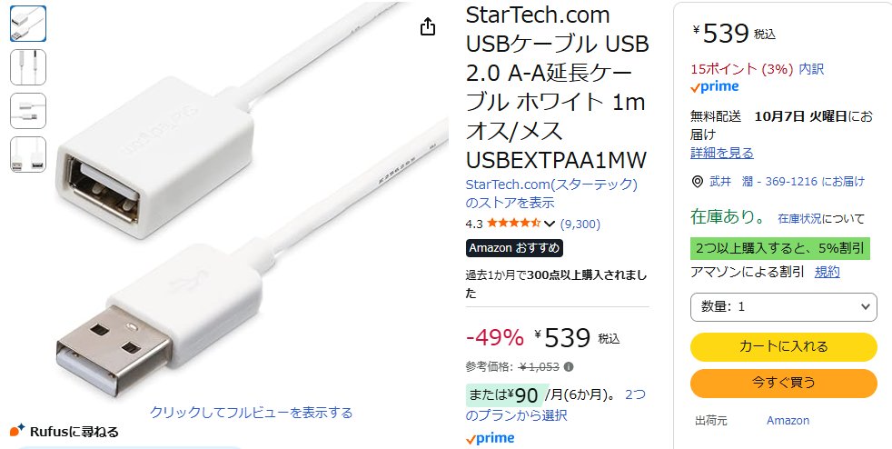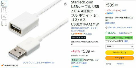 アマゾンで購入のストレートのUSB延長ケーブルが到着しました。