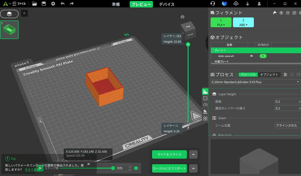 3DプリンタのスライサでSTLから3Dプリンタ用のgcodeを生成します。