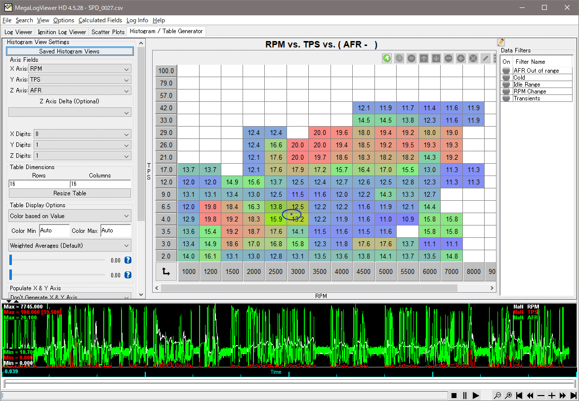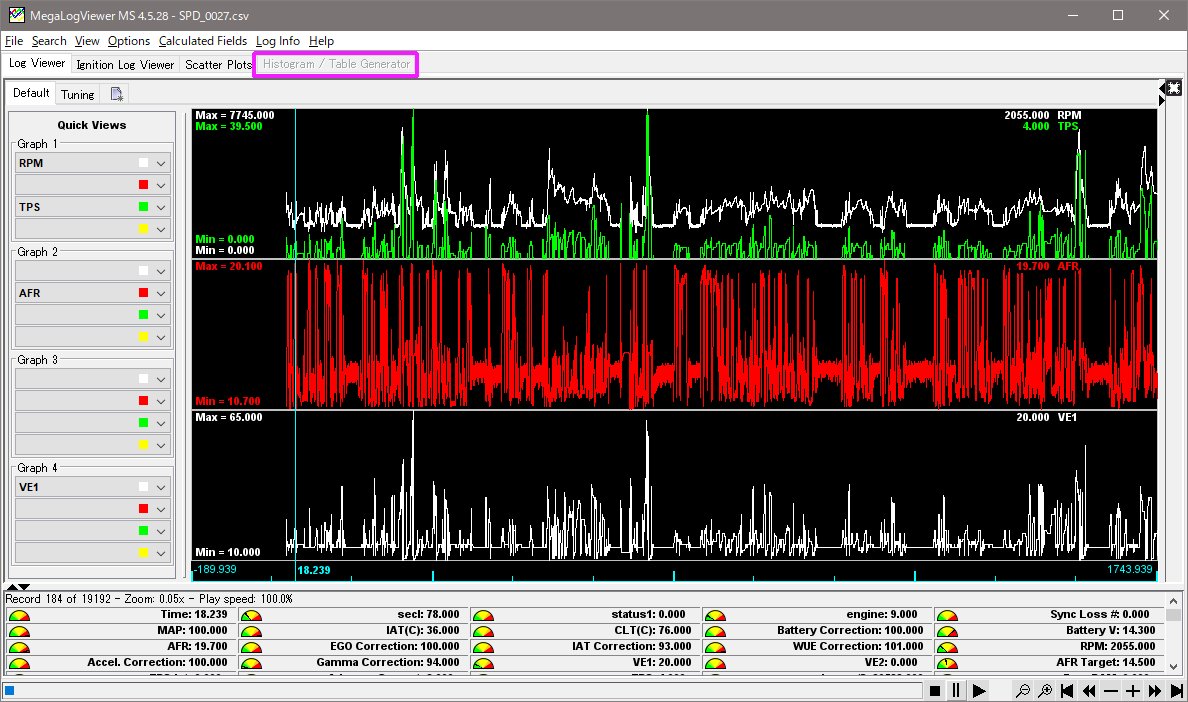 有償版のMegaLogViewerの続きです。HDにアップグレードしました。下はヒストグラム表示です。公道では広範囲のスロットルポジションとエンジン回転数を得るのは難しいです。