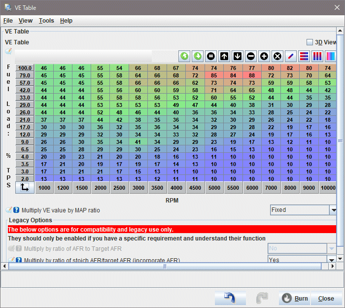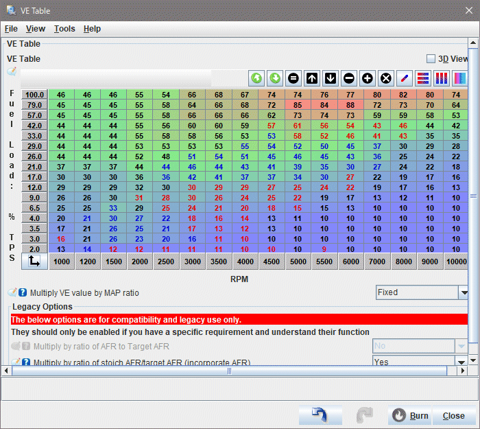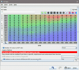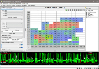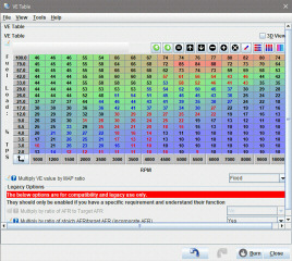 オリジナルのテーブルと比べてみます。左がVEアナライザで生成されたテーブル、右はオリジナルです。テーブルを生成する動作は手動で行うとのと同様に、ヒストグラムで燃料が濃いところを薄く、薄いところを濃くしていると思います。