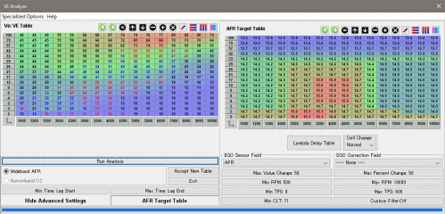 VEアナライザを使って燃調テーブルを解析します。左が解析で生成された燃調テーブルです。セル内の数字の赤は噴射量を少なくした値、青が噴射料を多くした値です。黒と青は区別しにくいです。