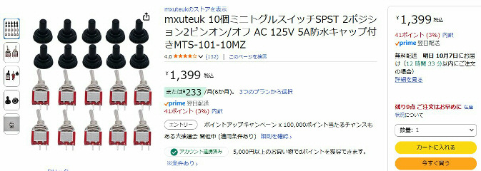 切り替えスイッチはゴムキャップ付きの防水タイプをアマゾンで購入しました。
