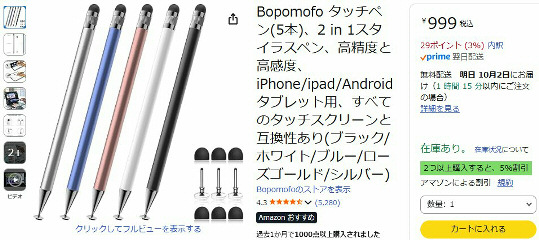 7インチタブレット用にスタイラスペンを購入しました。10インチタブレットは電磁式でしたが、今回は静電式です。5本も要らないんですが(笑)。
