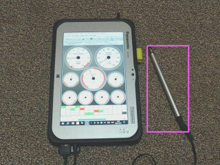 ホルダはバーコードリーダのクリア窓に付けました。スタイラスペンはヘッドフォンの3.5mmジャックに要らないケーブルを使って失くさなように繋げておきます。有償版TunerStudioはゲージのデザインができます。縦置のデザインにしてみました。