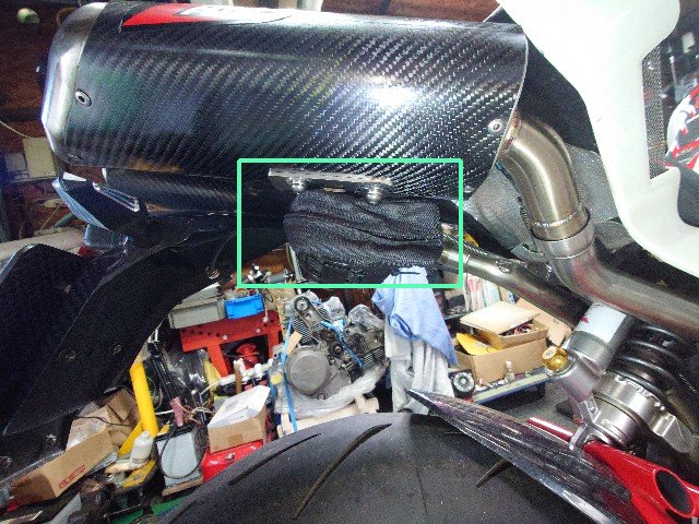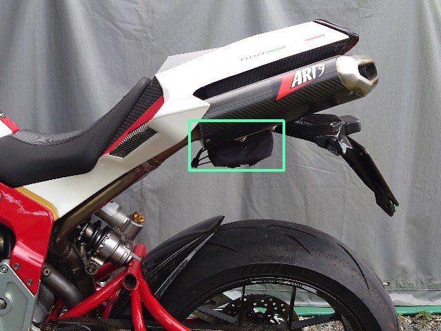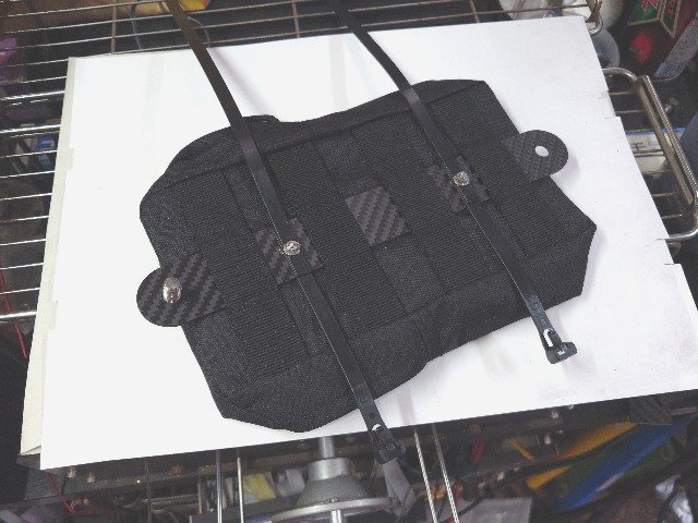 月末に遠乗りの予定があるので、いままでバックパックに入れていた工具をヤフーオークションで購入のナイロン製のアーモポーチに入れて車体のサイレンサの下に取り付けます。材質がナイロンなの、耐熱性が心配です。カーボンのステーと脱落防止のタイラップを取り付けました。