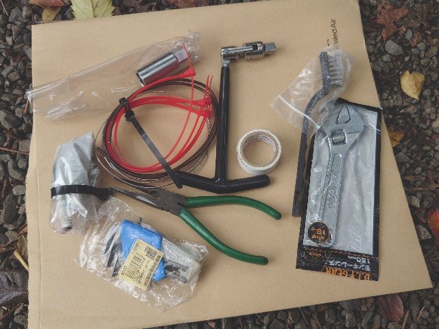 工具一式です。スペアプラグ、プラグレンチ、6角レンチ、針金、ラジオペンチ、モンキーレンチ等。O2センサで燃調補正するとプラグはかぶらないと思うのでプラグとレンチは要らないかもしれません。