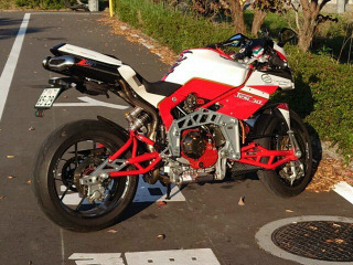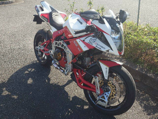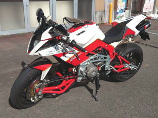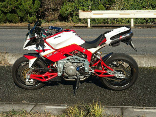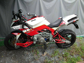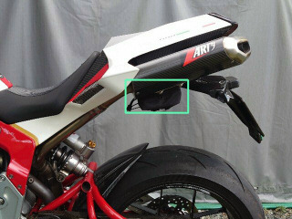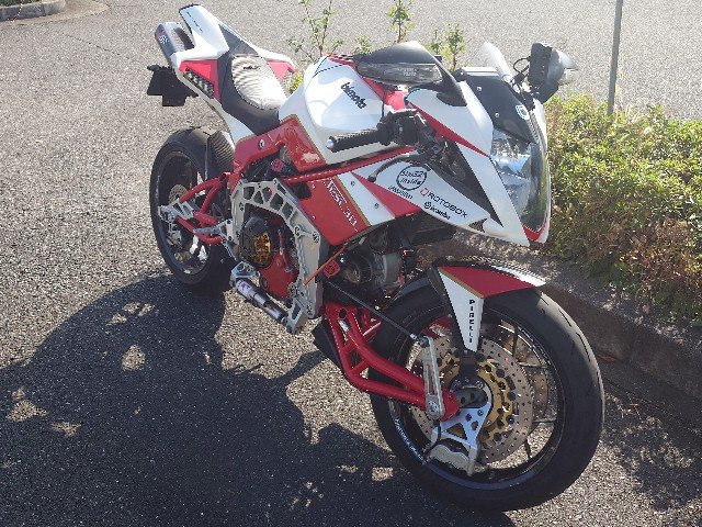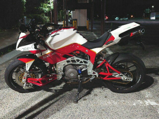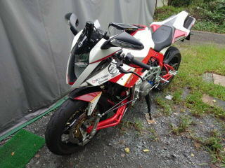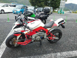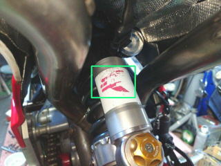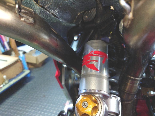 オフ会に行く前の朝の作業です。リアショックはエクストリームテック製です。ステッカは昔インクジェットプリンタで印刷したものですが、左右にエキパイがあって過酷な環境です。熱で印字がボロボロです。耐熱性を上げて再作します。