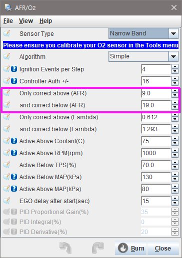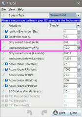 燃調補正の設定ダイアログにAFR値の上限と下限があり、デフォルトで9から19の間に設定されています。この範囲を超えると制御は停止します。上の赤枠は19以上で制御が停止している部分だと思われます。噴射量の調整範囲はプラスマイナス16%が上限で、この範囲で補正できるマップが用意されていないと、上手く補正できません。その他、計算ステップがデフォルトで4回点火毎になっています。