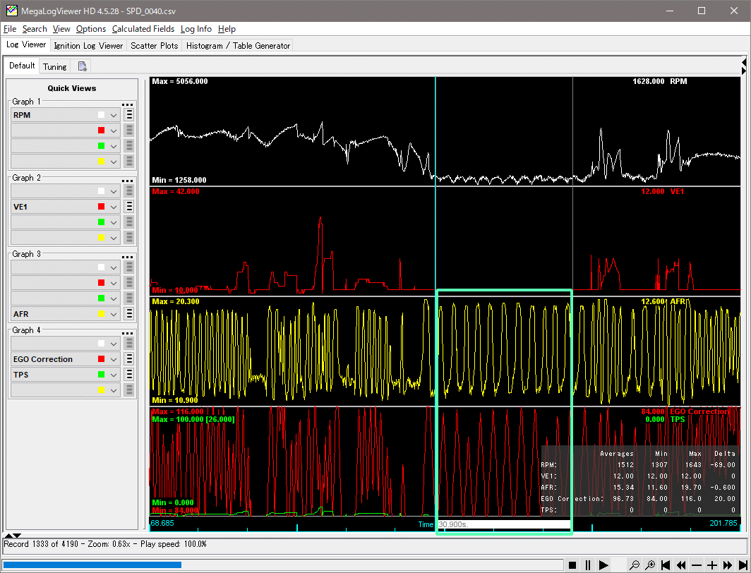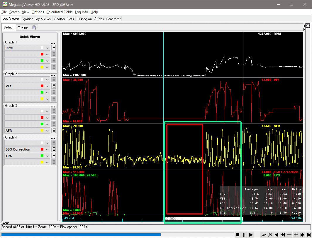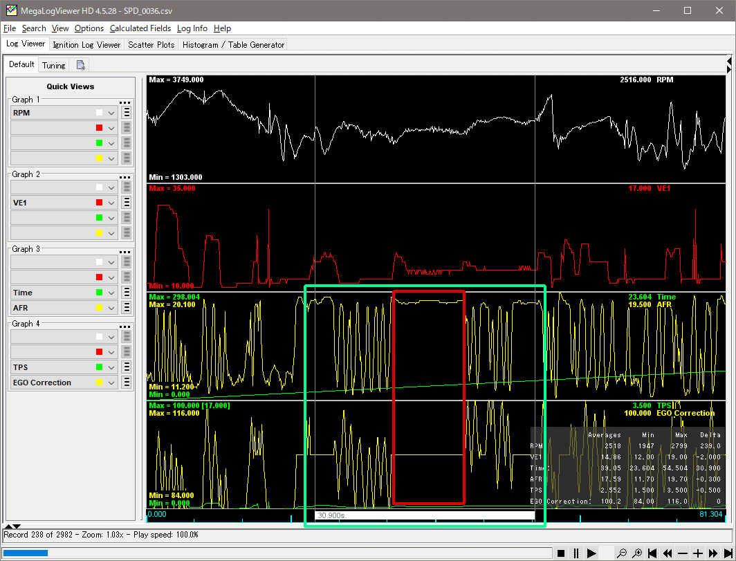 近所を一周しただけですが、19以上の薄い方で張り付きは無くなりました。緑枠は30秒間です。赤枠はアイドル中でAFR13位でEGO補正は目いっぱい薄く−16%に制御していますが、AFRは13より薄くなっていないことが分かります。これはマップを調整する必要があります。