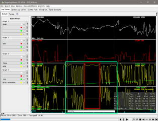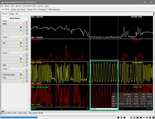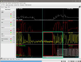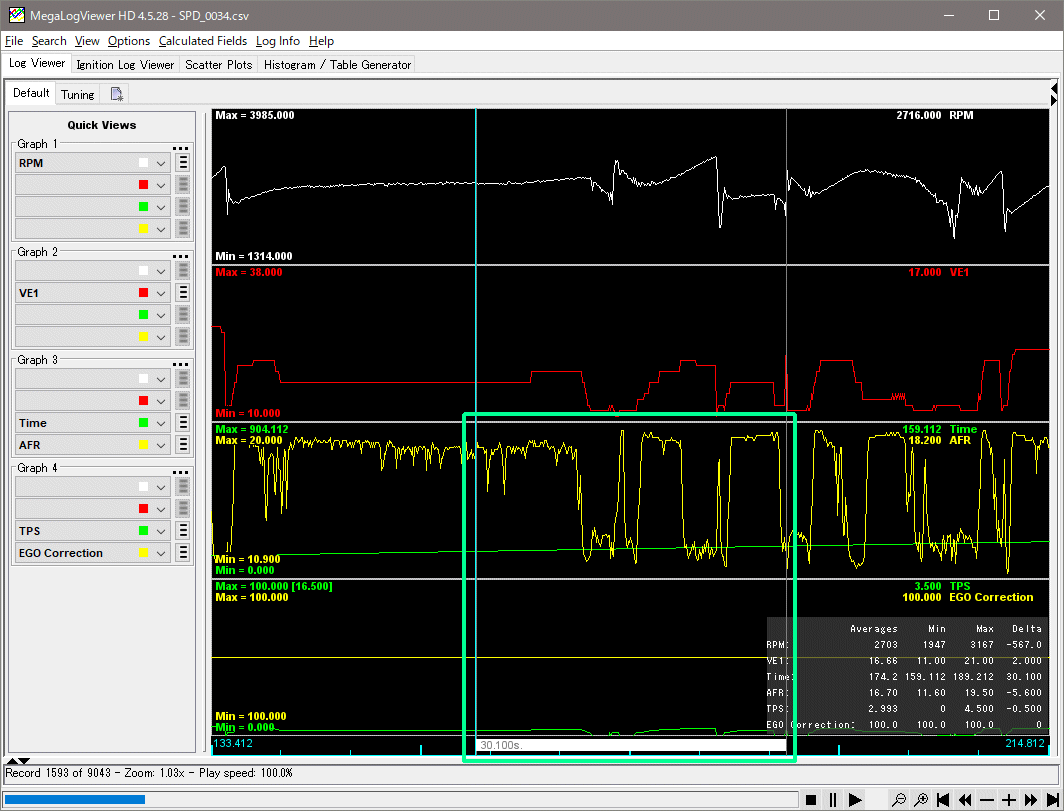 O2センサによる燃調補正も試てみました。緑枠は30秒間のAFRとEGO補正です。目標の14.7に近づくように噴射量を制御してフィードバックします。ナローバンドのO2センサなので、AFRは激しく振動します。TunerStudio内のゲージも同様の動きです(動きが早くてAFR値として読み取れない)。これは平均化すると14.7になるということだと思います。この時には同じO2センサの信号を分岐しているメータユニットのAFRは14.X付近を表示しています。時定数が長く表示が平均化されているからです。TunerStudioとメータユニットのAFR値は14付近では大体揃っていますが、これを外れるとズレが大きいです。例えばTunerStudioで19の時、メータユニットでは16を表示しています。