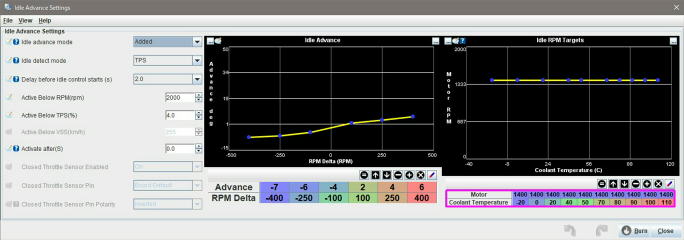進角によるアイドル調整を試てみました。テージのデフォルトの1400rpmに設定して、進角でフィードバックします。設定すると、発進時に少しギクシャクしますが、正しく動作しているようです。切り替える回転数とアクセル開度を調整すると改善しそうです。