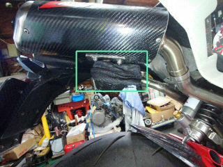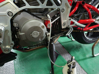 サイレンサのステンレスステーにカーボンで作ったステーで共締めします。
