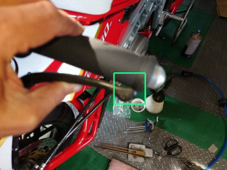念のため、両端が抜けないように赤枠に3mmのネジを切って、ボルトを貫通させました。車体に取り付けました。