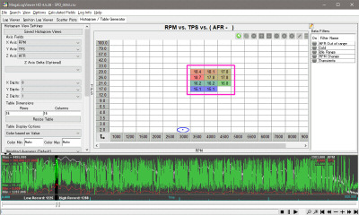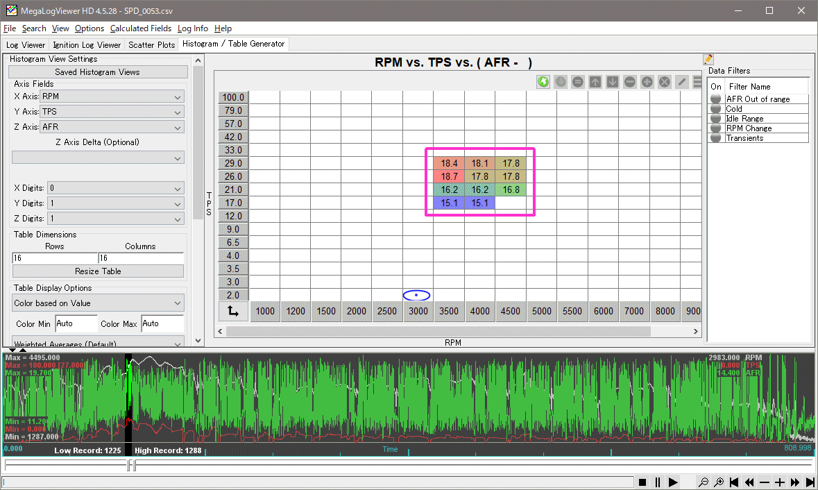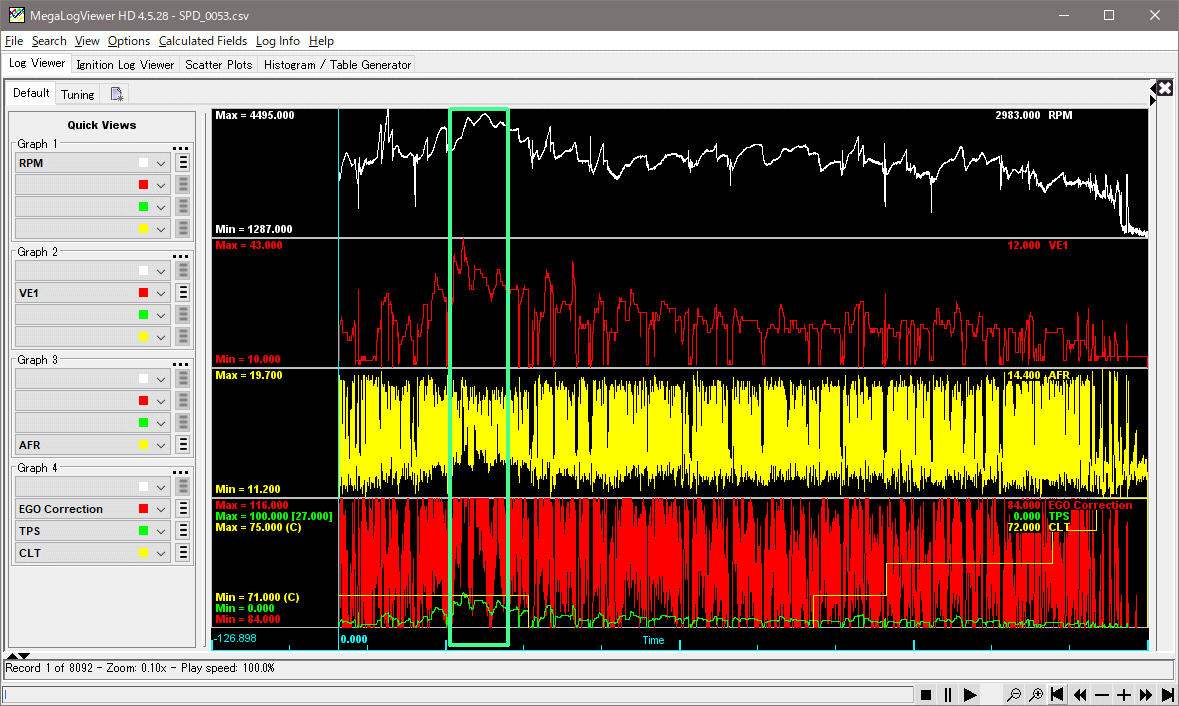 買い物の後で、東松山経由の下道で帰還しました。早速、高速のログ解析します。緑枠はちょっと薄い所です。下の赤グラフはEGO補正で均一に交番していない所は補正しきれてない所です。上側に寄っている場合は薄いことを表します。
