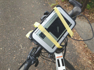 2台目のGPSモジュールが届いたので、早速、動作確認します。USBケーブルを60cmに短くして、タブレットとモジュールを自転車に取り付けました。