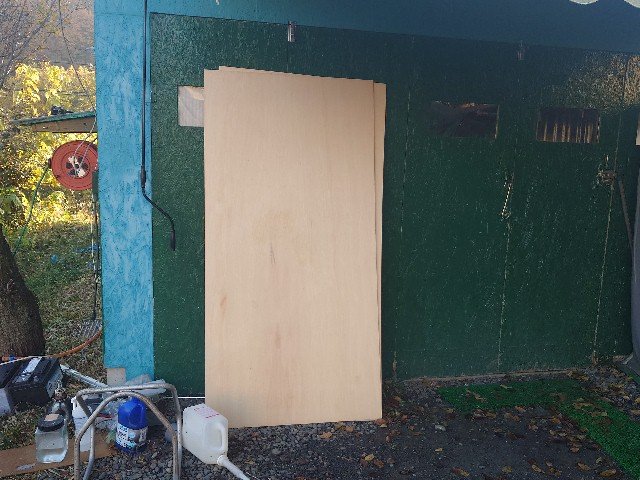 下から約60cmを切り取り、新しいOSBに貼り替えました。東側からは旋盤が見えます。
