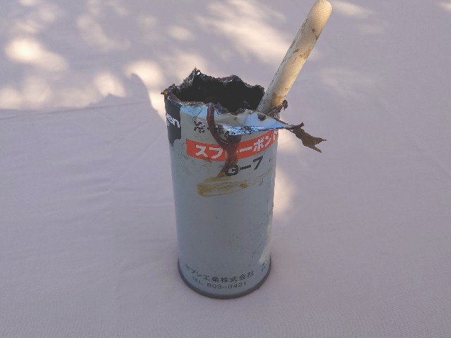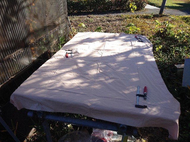 合板と布はスプレーボンドで接着する予定でしたが、噴射剤が抜けていました。缶を切って刷毛を使いました。