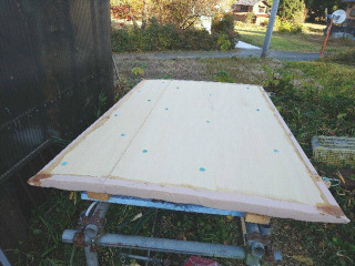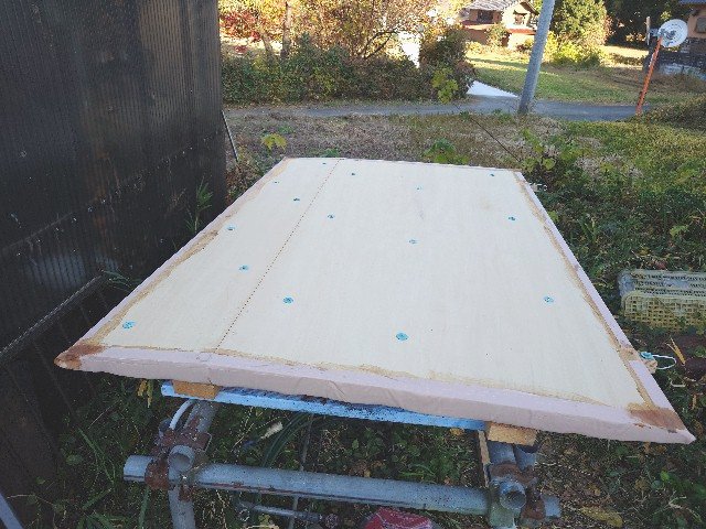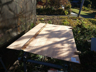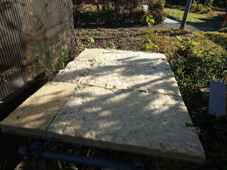 テージの部品取りエンジンを運んだ時に買った9mm厚のOSBを使います。本当は12mmが欲しかったんですが、カインズには売ってなかったです。9月の準備でウレタンシーリングをコーティングした新しいOSBを丸ノコで1/3幅の約30cmで切断します。