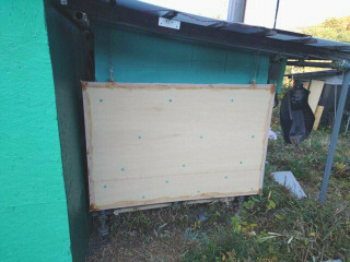 防音パネルを発電機の横に戻しました。合板の厚みを4mmにしましたが、まだ重く、移動は大変です。