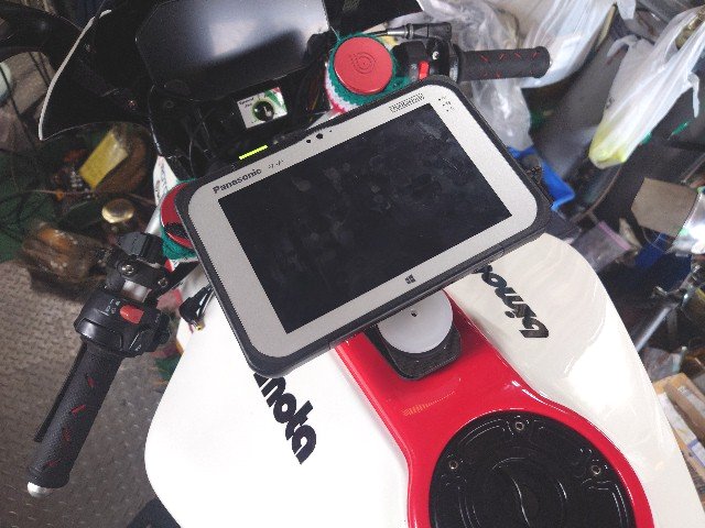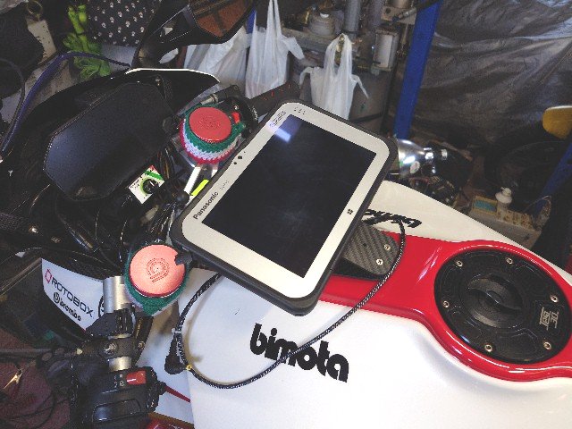 TunerStudioで使っているタブレットを横置きにします。TunerStudioは縦置きでも良いのですが、縦置きだとファイルダイアログやエクスプローラがすごく使いにくいです。下は仮止めしたところです。