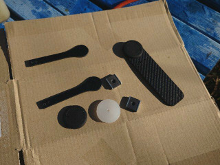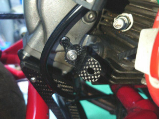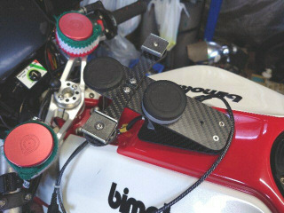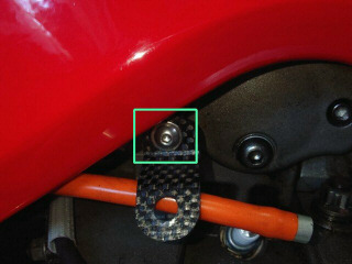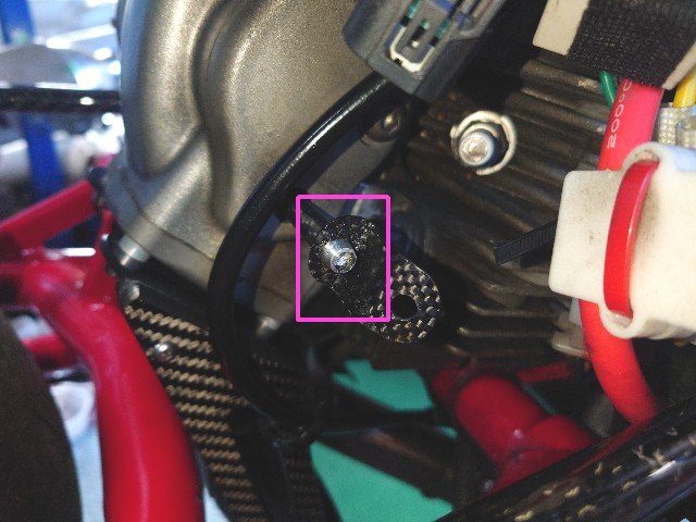 赤枠が現状のステーとスペーサです。カーボンパイプのスペーサを挟んで6角穴付きアルミボルトで共締めしています。