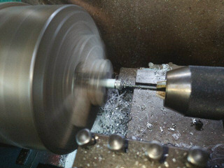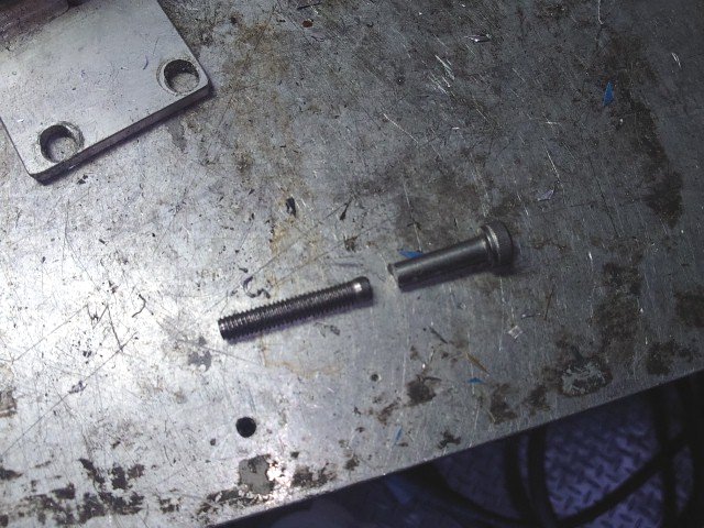 対策として、元の6mmの6角穴付きボルトの頭に4mmのネジを切って、別の4mmボルトでステーとスペーサを固定するようにしてみます。6mmの6角穴付きの頭に3.3mmのドリルで穴開けします。その後、4mmのタップでネジを切りました。