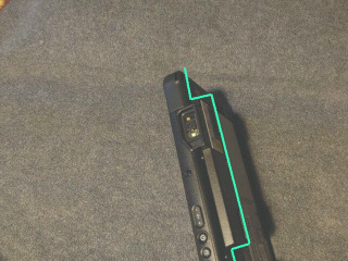 横置きにするには、タブレットの下面にある緑線のバーコードリーダの凸部を避けるスペーサを作製する必要があります。