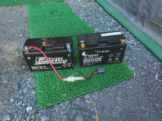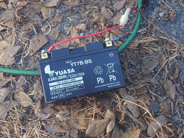 バッテリは完全にダメになっているので、灯火系がまったく動きません。なので、エンジンはかかりますが、試走はできません。バッテリは安売りの互換品を注文しておきました。