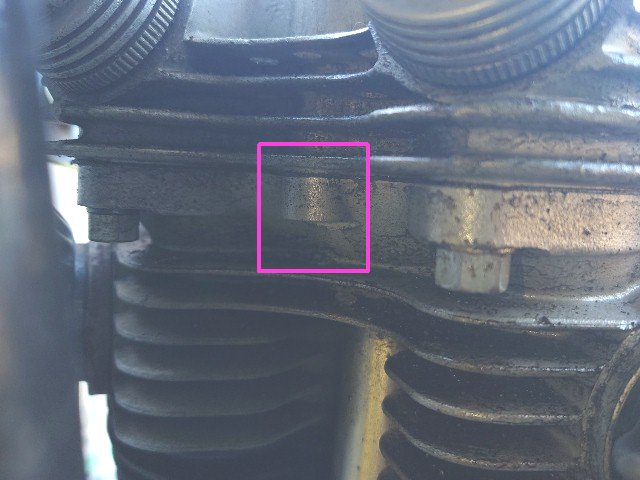 信号待ちなどでエキパイにオイルがついて、けっこう白煙が出て、ちょっとはずかしいのでオイル漏れの対策をします。古いトライアンフはオイルシールが無いところもあって、ある程度はしょうがないです。初めにオイルの漏れているところを確認します。タンクを外してヘッドが見えるようにします。9本スタッドです。ロッカーカバーは後期のユニットのものと思います。