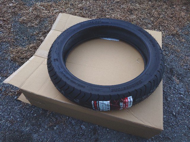 ヒビが多いので、リアタイヤをDIYで交換します。タイヤは通販で注文しておきました。サイズは120/80−18です。