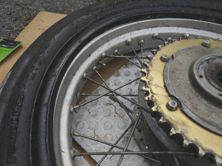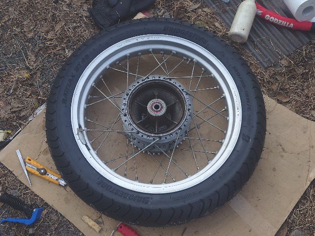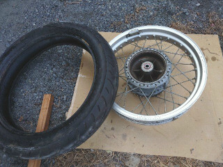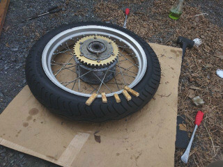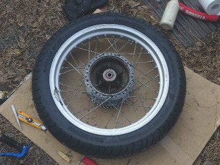 チューブを入れて、新しいタイヤをはめていきます。最後はすごくキツイです。両面とも、木片を挟んでビードが上がらないようにすると入りました。最後は1インチホイールが大きいじゃないかと思うくらいキツイです(笑)。