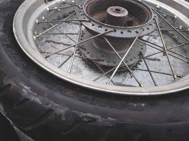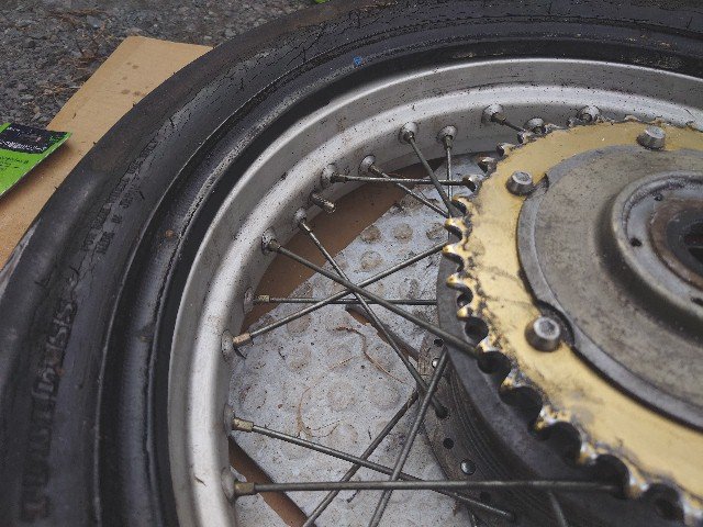 タイヤは硬化してカチカチなので、タイヤレバーでは歯が立たず、万力に挟んでどうにかビードが落ちました。