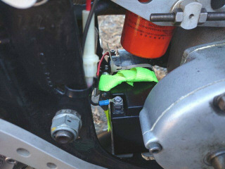 バッテリが到着しました。さっそく交換しました。外れないように、細いタイダウンで括り付けておきます。