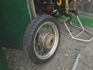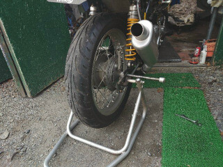 リアにスタンドを掛けてアクスルを抜いて、タイヤを取り外します。