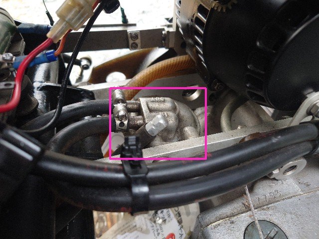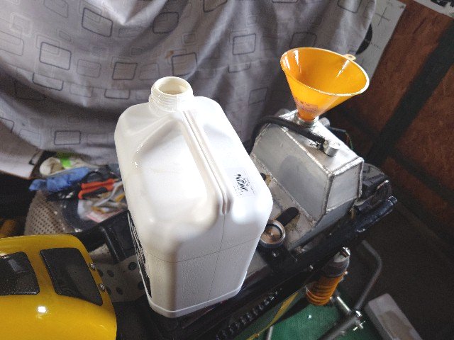 オイル交換します。オイルのほどんどはシート下のタンクに入っています。 ホースを外して、オイルタンクのオイルを抜きました。