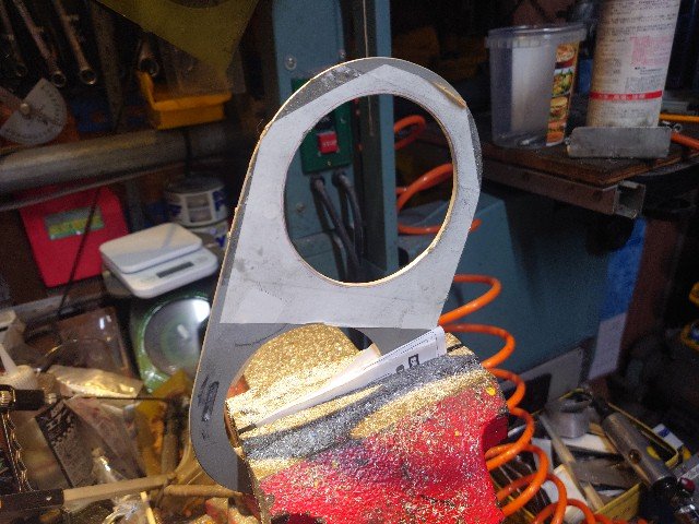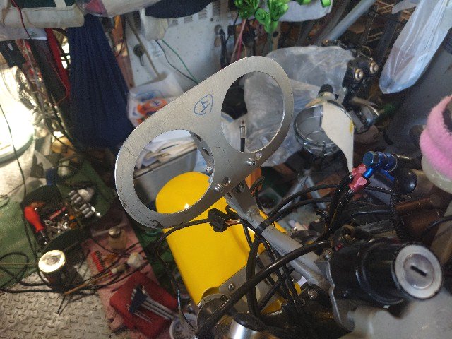 メータパネルの2.5mm厚アルミ板に開いているタコメータの穴をクロノ用の80mmに広げました。図面を書いて、CNCで削るより、ドリルとエアリュータの方が早いので手動で加工しました。この後、防振のスポンジゴム、表面パネルのカーボン板の作製が必要です。