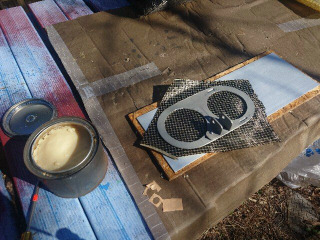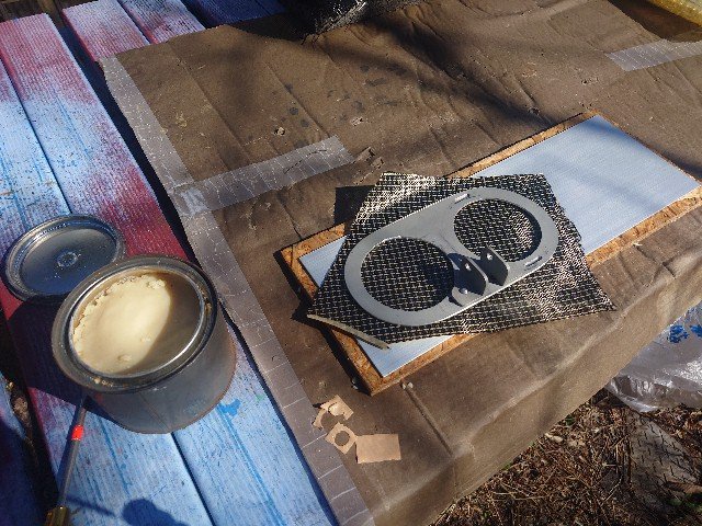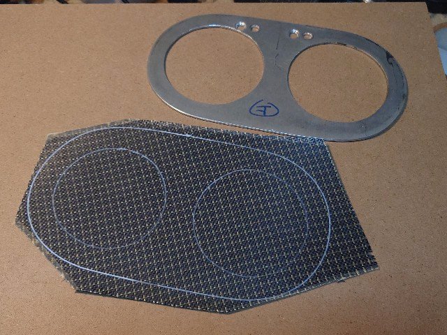 メータパネルの表面に貼るカーボン板を作製します。ケブラ入りカーボンクロスと普通のカーボンクロスをベース板に合わせて切り出します。型のアルミ板は離型ワックスを塗っておきます。