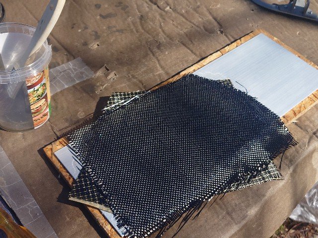 ケブラ入りとカーボンクロスを2層でポリエステル樹脂で積層しました。