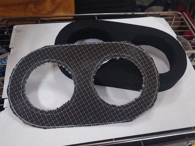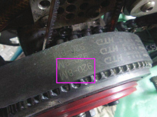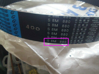 左はガレージの天井物置から出てきた1号車の予備に購入した40mm幅のプライマリタイミングベルトです。ボブニュービー製のクラッチ/タイミングベルトコンバージョン用で40mmはレース用です。長さは880で12000円くらいしたと思います。長さが同じなら、40mmを30mmに切って使えると思ったのですが、今付いている右の方は920で長く、使えませんでした。残念でした。