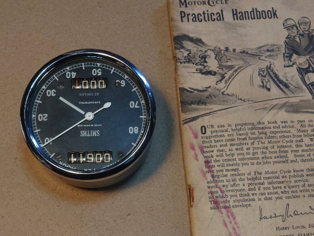 ebayで購入のクロノのスピードメータが到着しました。緩衝材なのか?おまけなのか?1959年出版の”motorcycle practical handbook”という小冊子が入ってました(笑)。オドメータのリセットノブが無いです。時計回り、照明は6Vの電球が入っていました。これはLEDに交換します