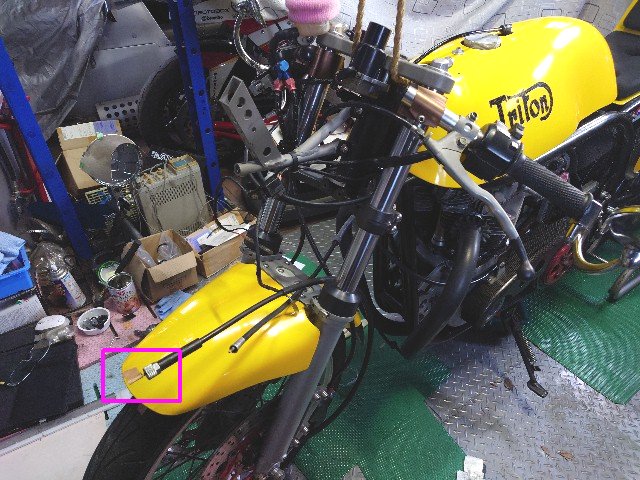 クロノのスピードメータを仮止めして、フロントカウルと干渉しない取り付け角度を探します。赤枠にタイミングベルトを使った減速機構が入ります。スペースがキチキチです。