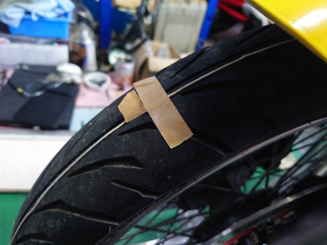 フロントタイヤの外周を測ります。タコ糸をまわして約180cmした。