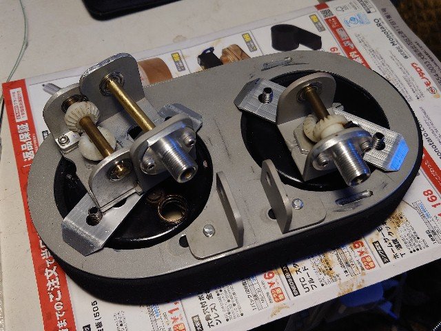 2つのホルダを重ねて使います。矢印がメータギアからの入力、左の小さい赤枠に18Tプーリ、右側に28Tプーリを取り付けます。プーリとベルトが来れば長穴加工をしてベルトテンションを調整できるようにします。