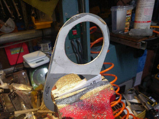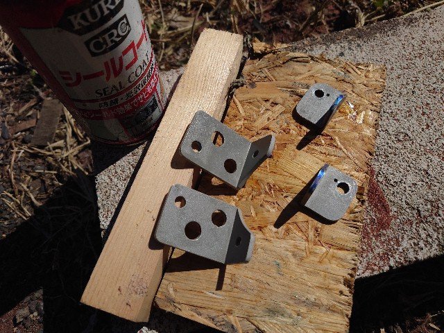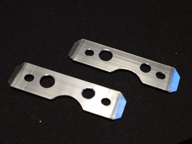 上で作製した20mmの延長ステーに軽量穴あけ加工して、サンドブラスト、シールコートで防錆しました。右は古いステーです。