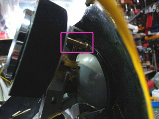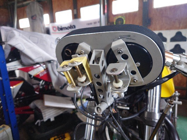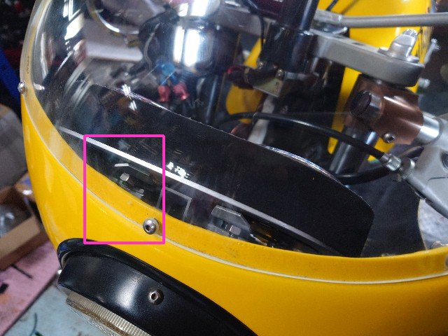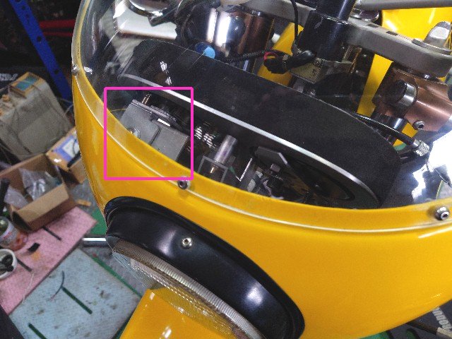20mm移動するとスピードメータの固定角度に自由度が出て、赤枠の減速機構も付けてギリギリでオドメータのリセットノブが右側で固定することができます。この状態でフロントカウルを仮止めします。