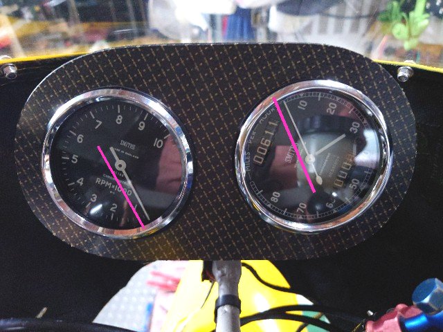 スピードメータの取り付け角度は下のような感じです。タコメータもスピードメータに針を合わせるとキレイです。